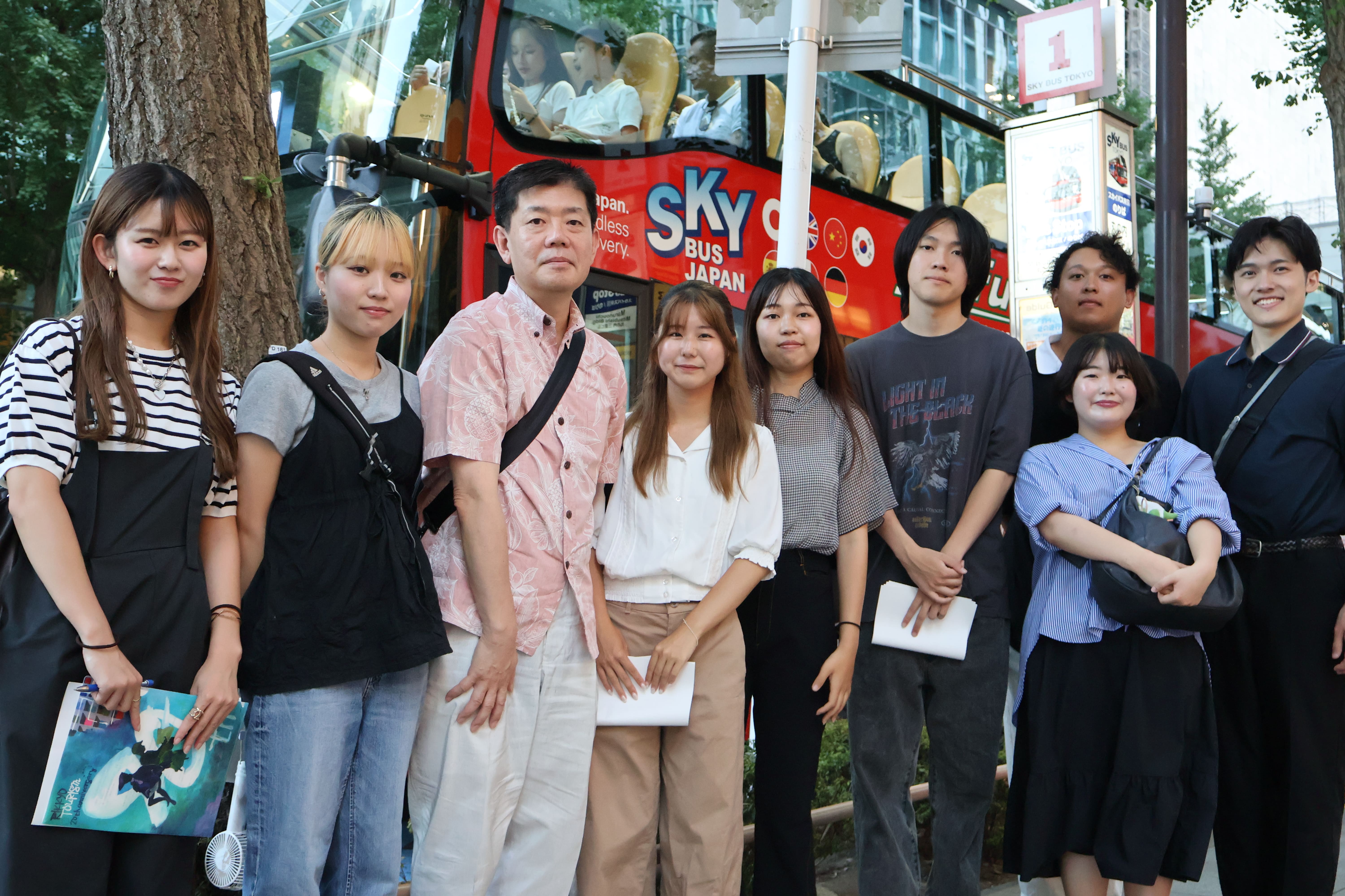 さらに、同じ演習に取り組む学生たちは、スカイホップバスツアーのオプショナル企画として、自ら企画したウォーキングツアーを訪日外国人旅行者を対象に実施しました。学生は英語によるガイドを担当し、観光現場での実践に挑戦しました。参加者からは「とても楽しかった」との声をいただき、学生にとっても大きな励みとなりました。