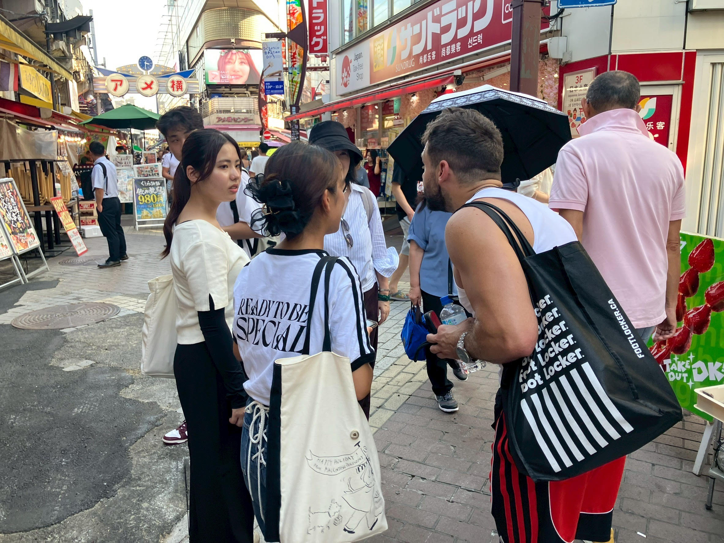 訪日外国人向けウォーキングツアーのガイドをする学生(アメヤ横丁にて)