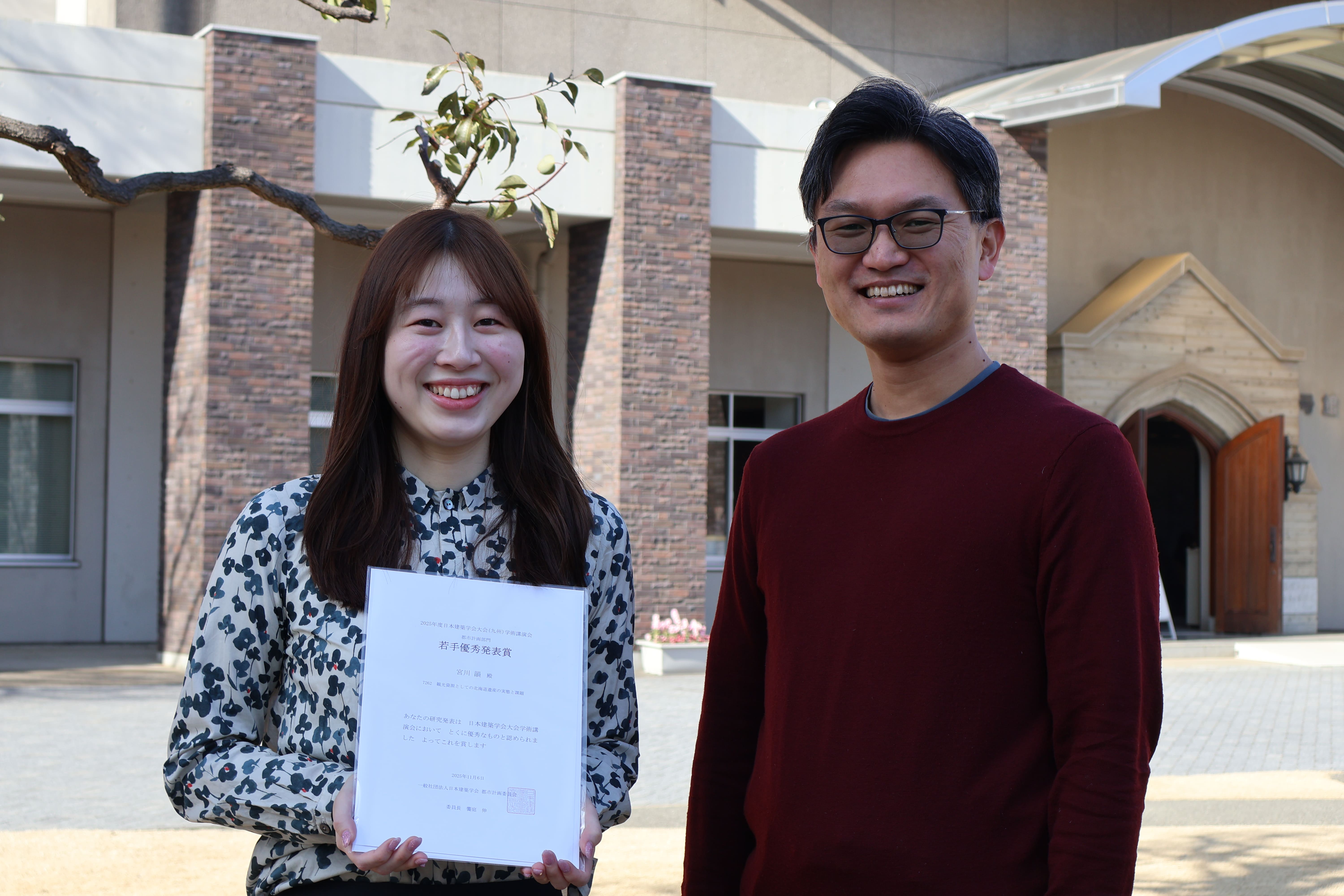 大学院博士課程前期課程1年生の宮川韻さんが、2025年9月に九州大学で開催された日本建築学会学術講演会で発表した論文「観光資源としての北海道遺産の実態と課題」で、若手優秀発表賞(都市計画部門)を受賞しました。